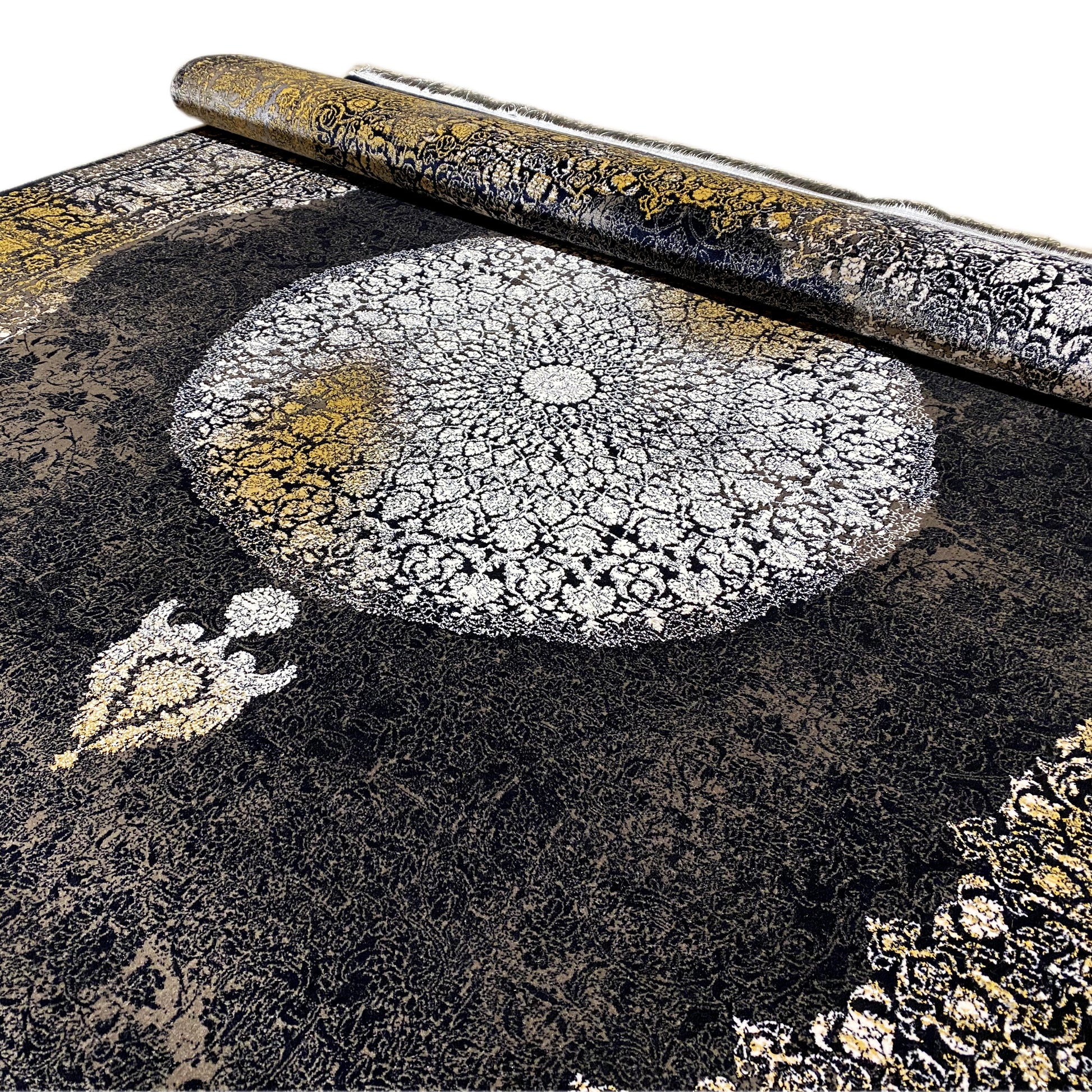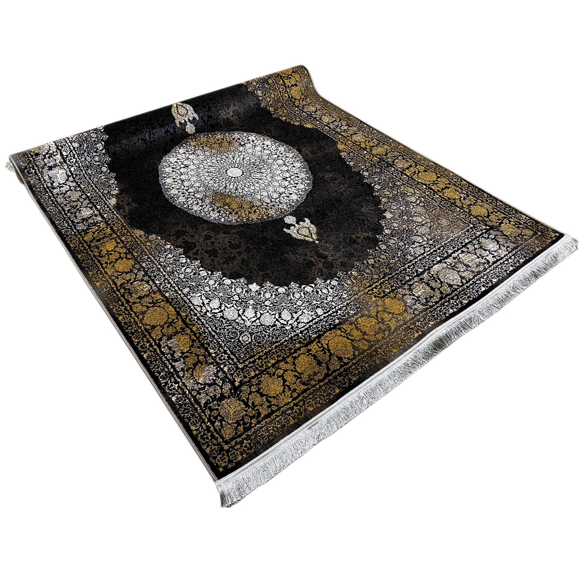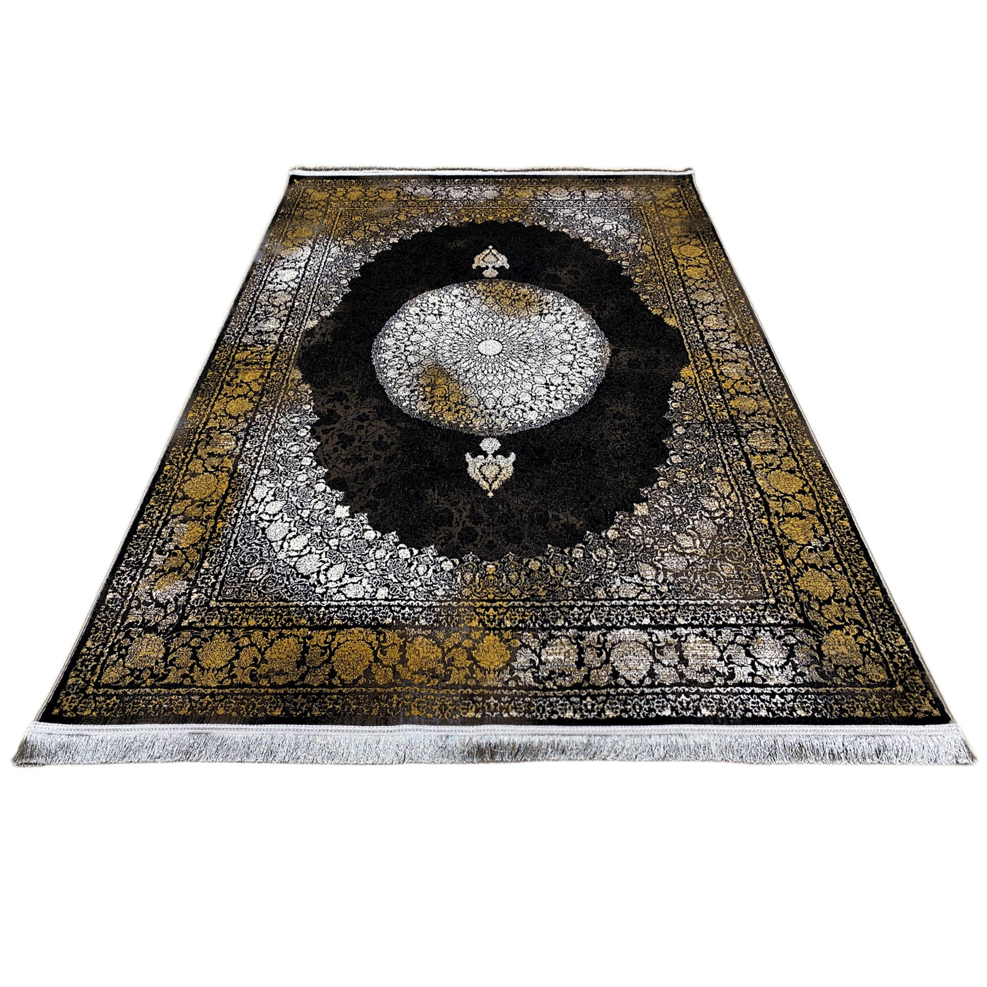 Apportez une touche d'élégance luxueuse à votre intérieur avec ce magnifique tapis classique. Le champ intérieur saisissant et fumé crée un contraste impressionnant avec la bordure dorée claire et le médaillon détaillé au centre. Fabriqué à 100 % en acrylique traité thermiquement, ce tapis doux et résistant est parfait pour les zones à fort passage, alliant style luxueux et durabilité moderne. La taille généreuse de 170x240 cm est idéale pour apporter un point focal élégant à votre salon ou chambre.