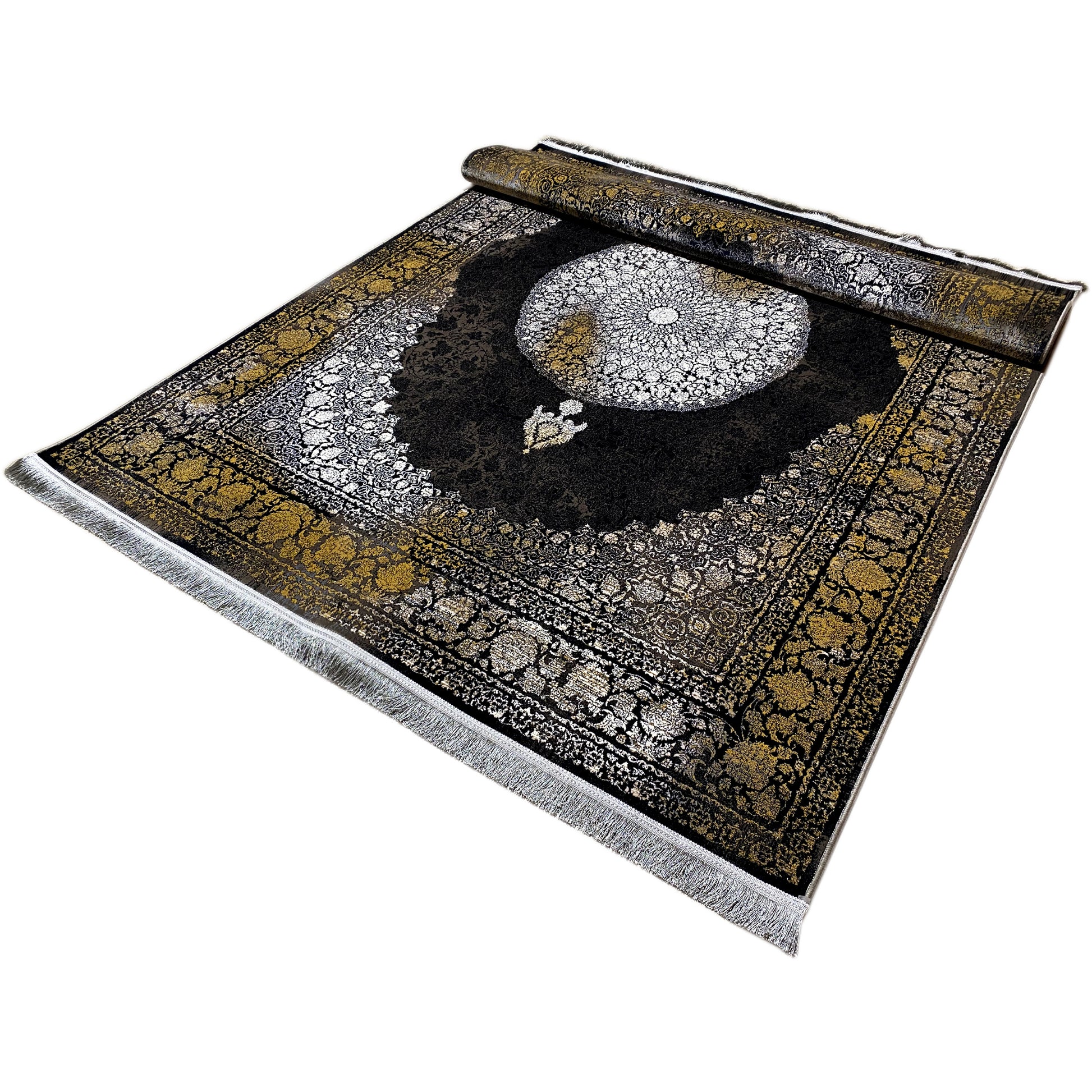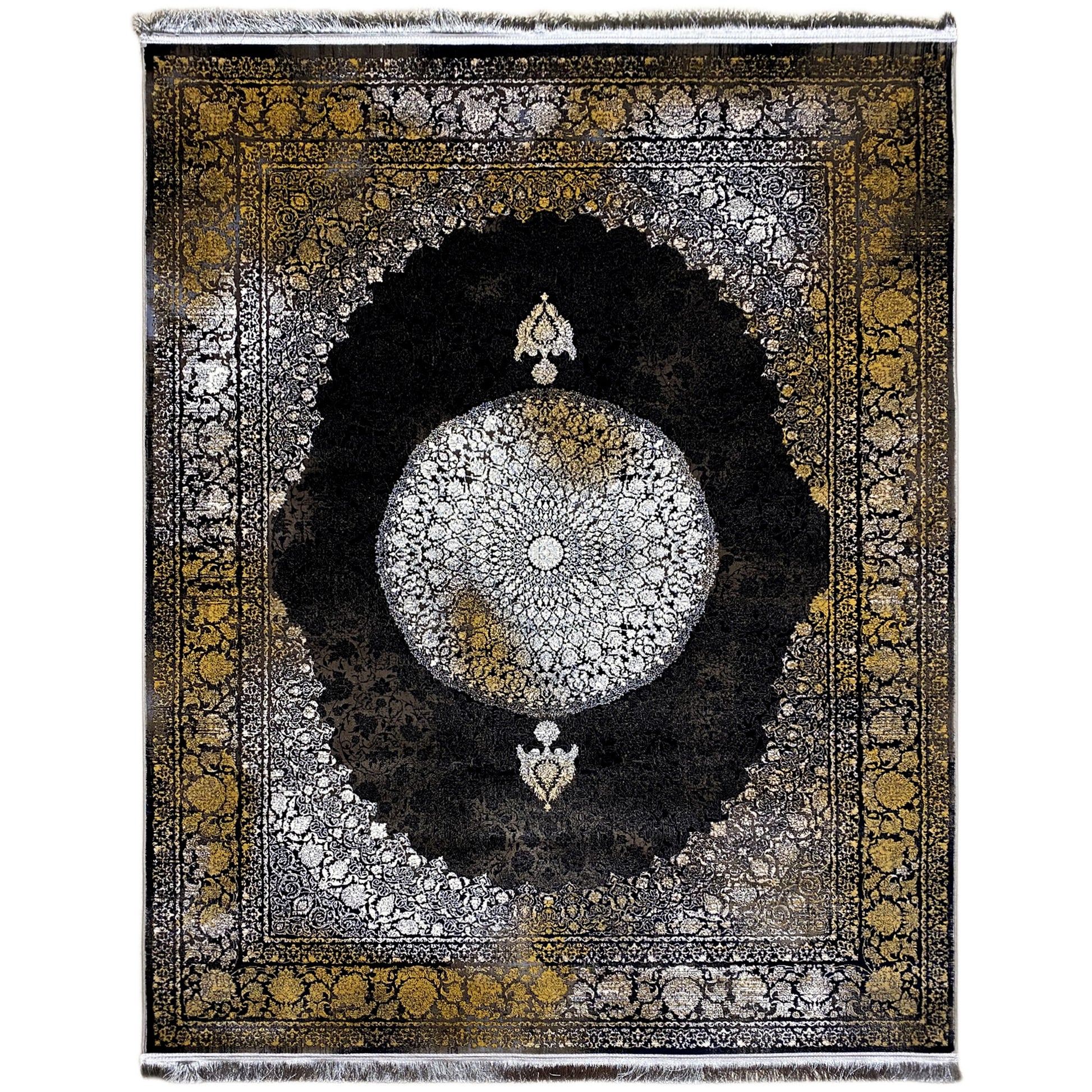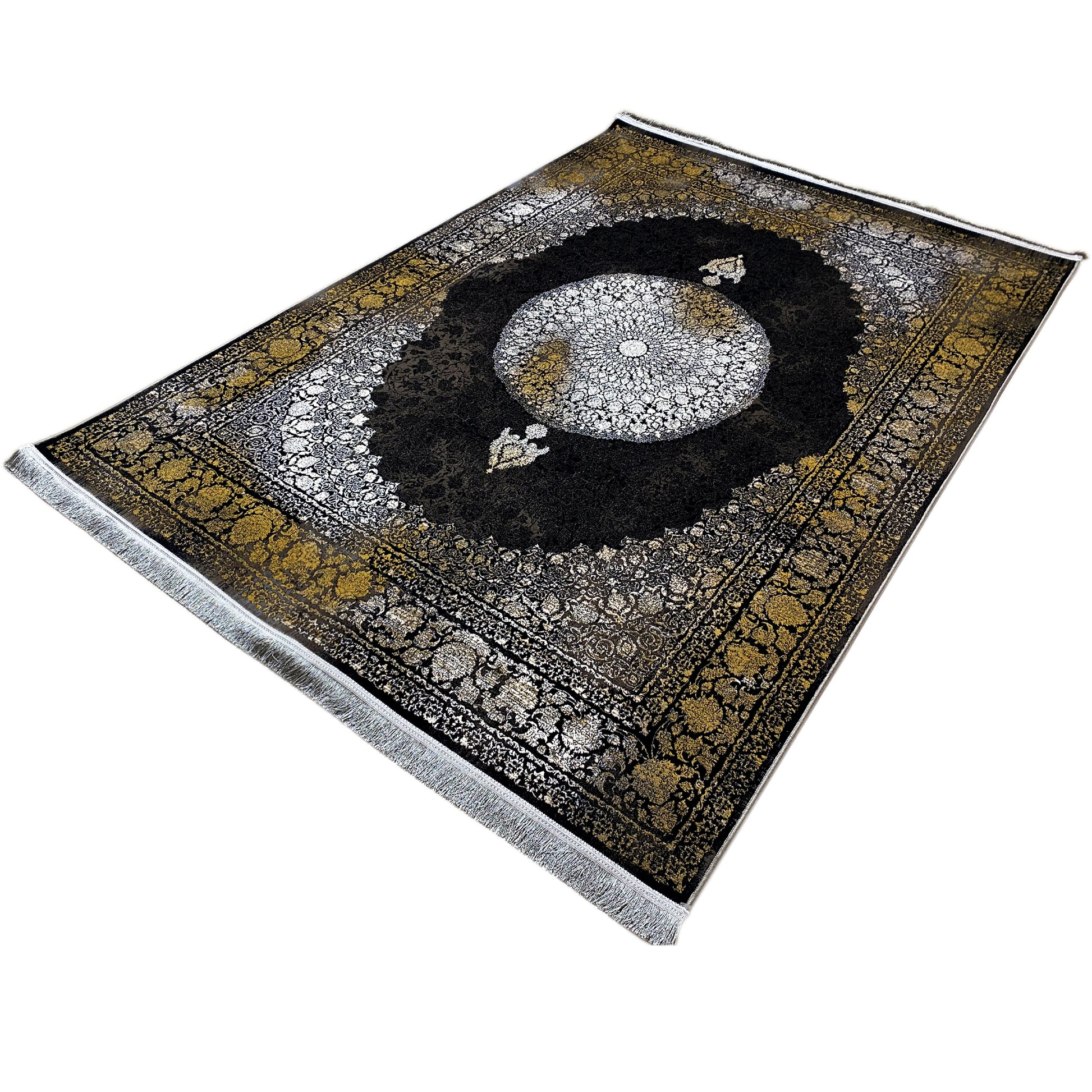 Apportez une touche d'élégance luxueuse à votre intérieur avec ce magnifique tapis classique. Le champ intérieur saisissant et fumé crée un contraste impressionnant avec la bordure dorée claire et le médaillon détaillé au centre. Fabriqué à 100 % en acrylique traité thermiquement, ce tapis doux et résistant est parfait pour les zones à fort passage, alliant style luxueux et durabilité moderne. La taille généreuse de 170x240 cm est idéale pour apporter un point focal élégant à votre salon ou chambre.