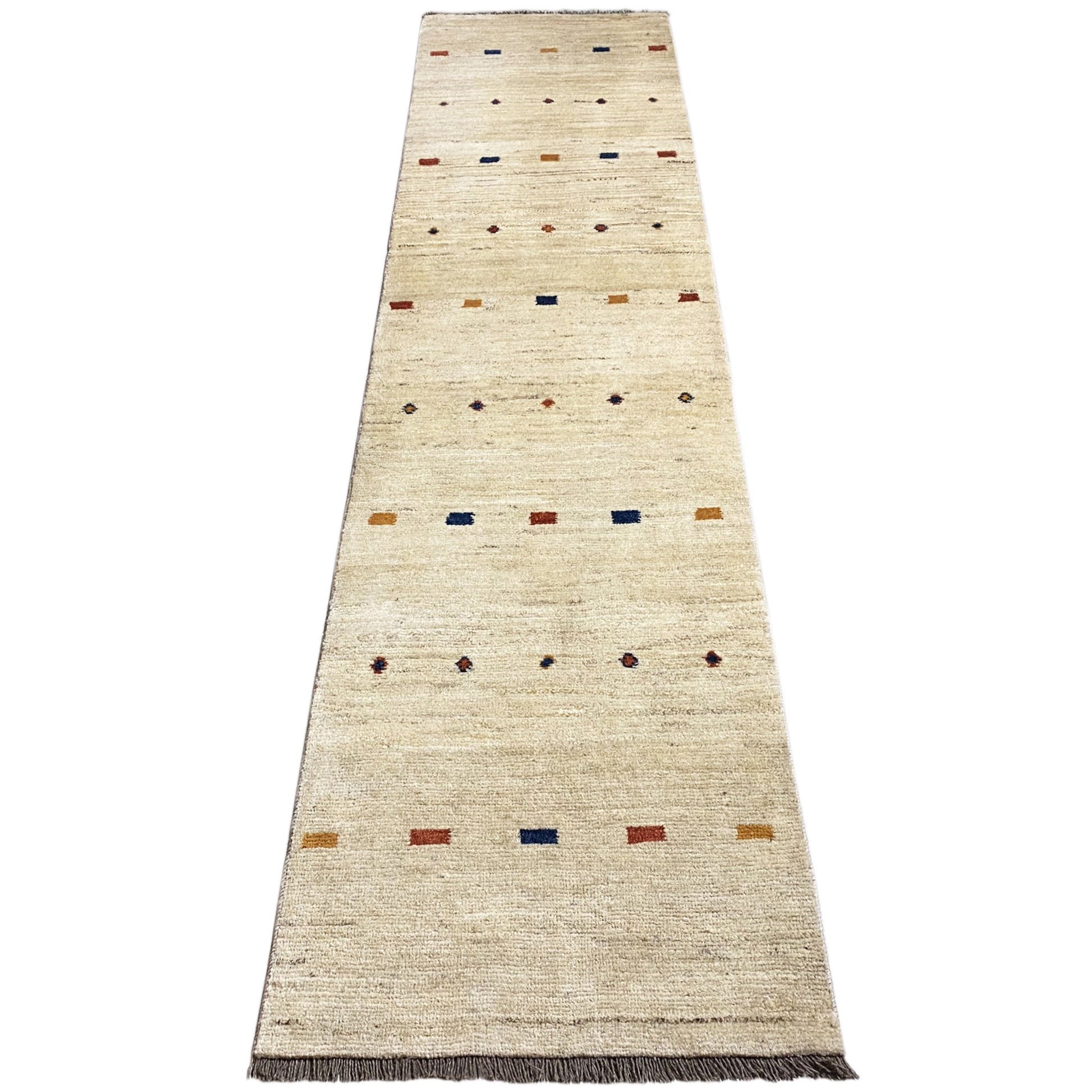 Ce magnifique, Le coureur Gabbeh noué à la main dans la grande taille 279x69cm est fait de laine filée à la main, fabriqué en laine teintée avec des plantes. Son design minimaliste sur fond beige est rehaussé de touches discrètes, animé par des accents colorés sous forme de petits points et de motifs horizontaux. Idéal pour les longs couloirs ou les styles d'ameublement minimalistes, ce coureur apporte une élégance tranquille et une chaleur naturelle à votre intérieur, tout en séduisant par sa beauté simple.
