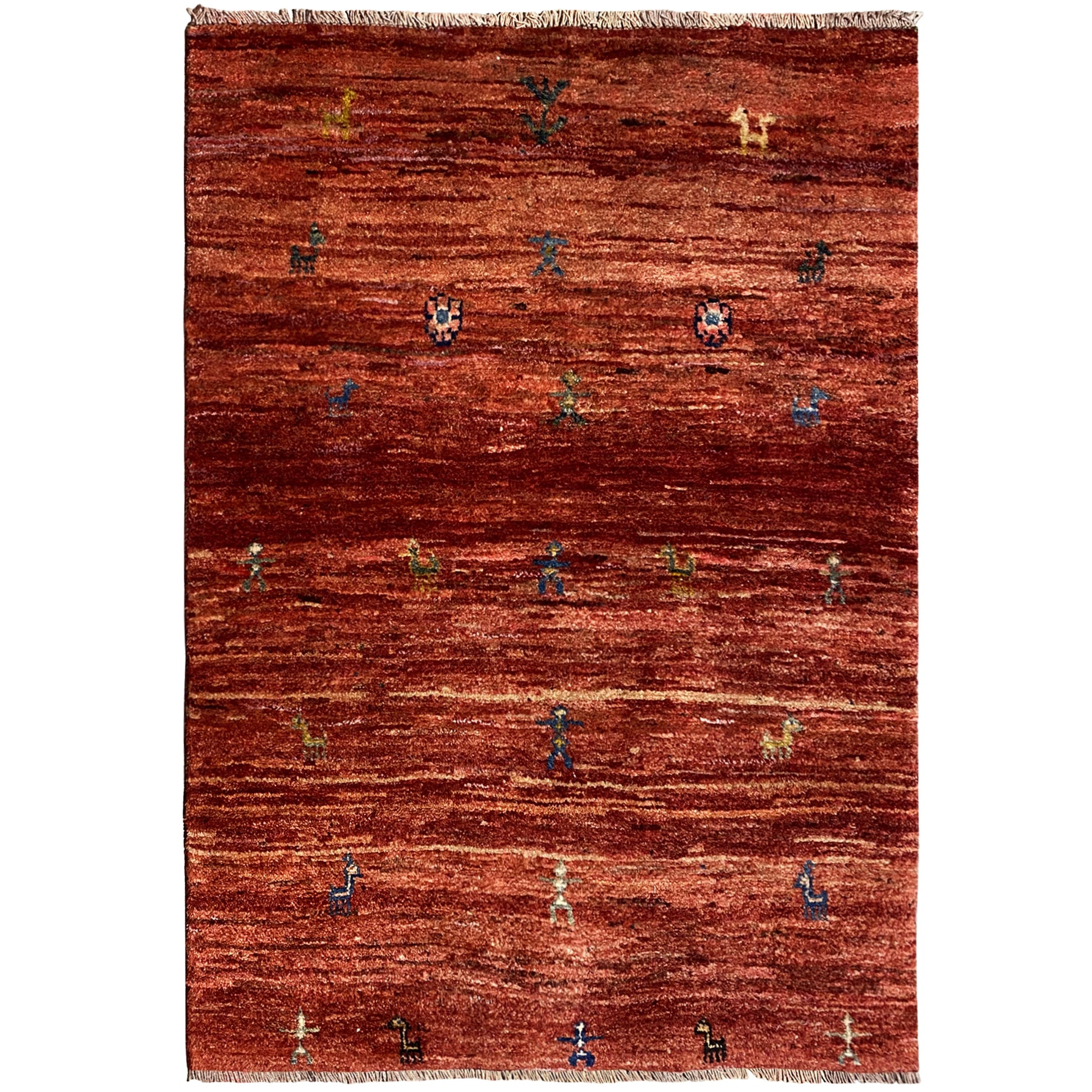 Ce tapis Gabbeh noué à la main, expressif, de taille 140x93cm, est fabriqué en laine filée à la main et teinte avec des plantes. Son champ rouge profond est animé par une multitude de petits motifs ludiques d'animaux et de personnages en accents colorés, racontant une histoire traditionnelle. Ce tapis unique apporte à chaque pièce, qu'elle soit de style rustique, tribal ou éclectique, une atmosphère chaleureuse et authentique, et constitue une véritable œuvre d'art pour le sol.