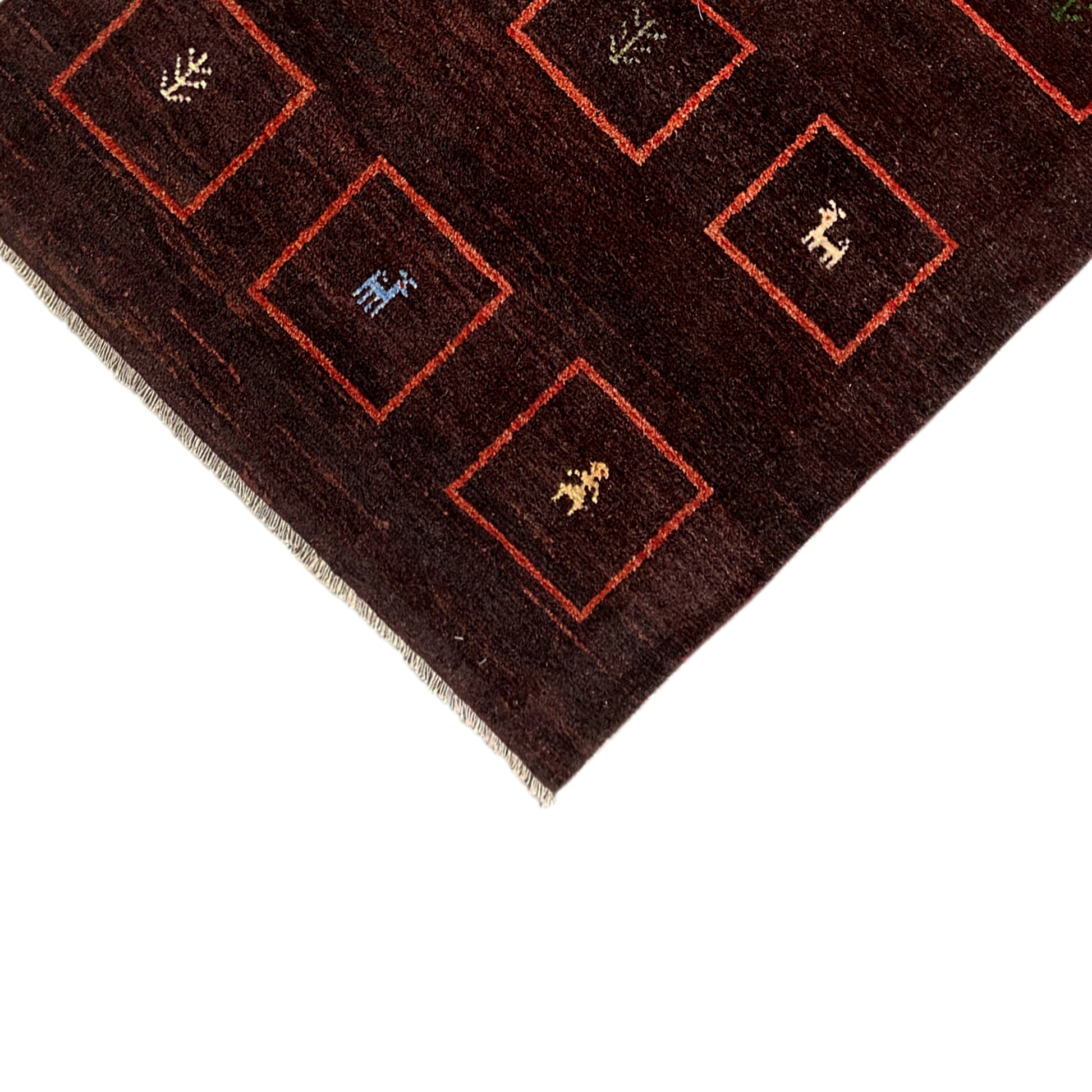 Ce tapis Gabbeh noué main expressif de taille 147x99cm est fabriqué en laine filée à la main et teinte aux plantes, et se distingue par un brun profond comme couleur principale. Son motif traditionnel en grille présente dans chaque carré rouge des motifs uniques, stylisés d'animaux et de figures, qui racontent une histoire. Ce tapis apporte une chaleur authentique et un charme rustique tribal à chaque maison et est une pièce unique durable.