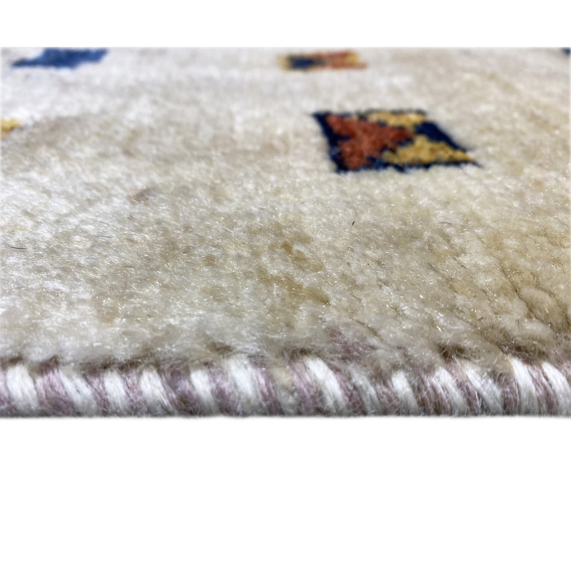 Ce tapis Gabbeh unique, noué à la main, de taille 152x89cm est fabriqué en laine filée à la main et teinte avec des plantes. Son design moderne se caractérise par un motif ludique de rectangles et carrés colorés sur un fond clair beige. Il apporte une touche vivante à chaque pièce, qu'elle soit de style moderne, contemporain ou éclectique, tout en offrant la chaleur naturelle et la texture d'un tapis Gabbeh authentique.