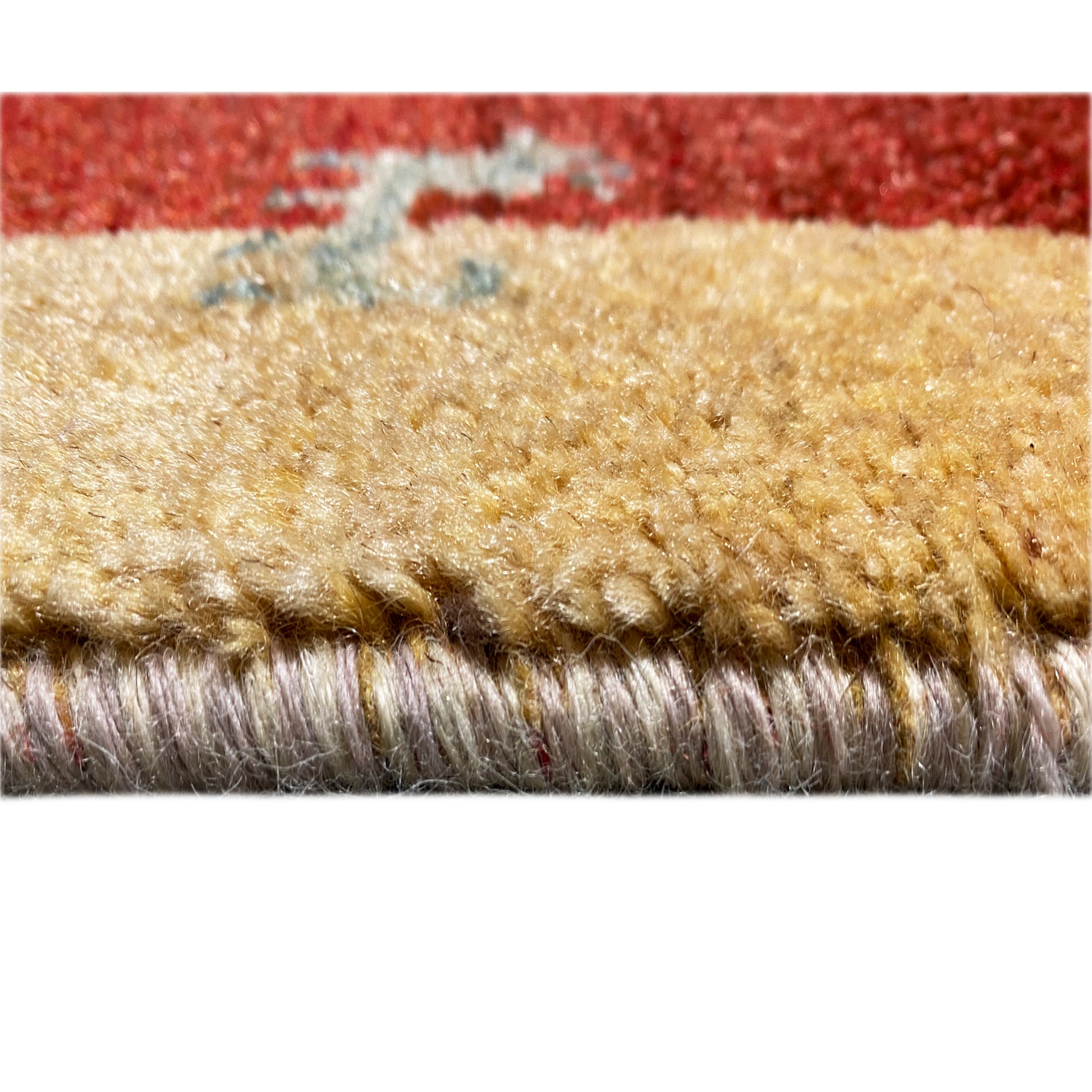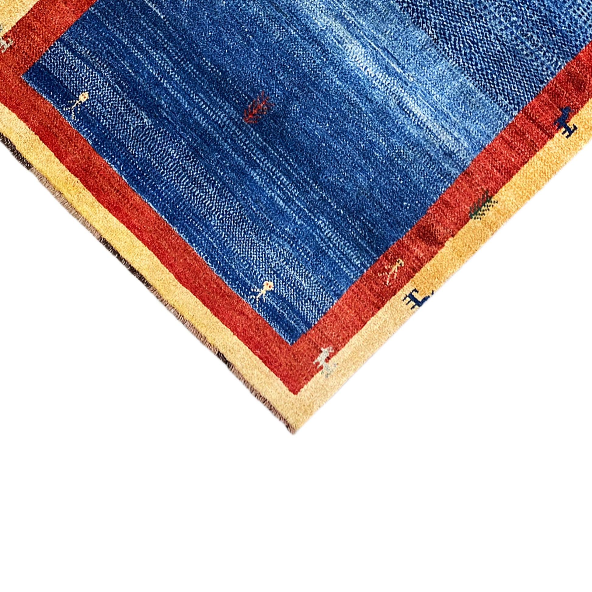 Ce tapis Gabbeh noué à la main, expressif, en laine filée à la main et teinte aux plantes, se présente avec un centre bleu profond, entouré d'une bordure intérieure rouge marquante et d'une large bordure extérieure jaune ornée de figures stylisées. Avec ses dimensions de 192x120 cm, il constitue une pièce polyvalente qui apporte à toute pièce, du style traditionnel au moderne, une atmosphère vivante et à la fois ancrée dans la nature. La combinaison de l'artisanat traditionnel, des couleurs éclatantes et du motif figuratif unique fait de ce tapis un élément remarquable qui suscite à la fois un intérêt visuel et une sensation de confort.