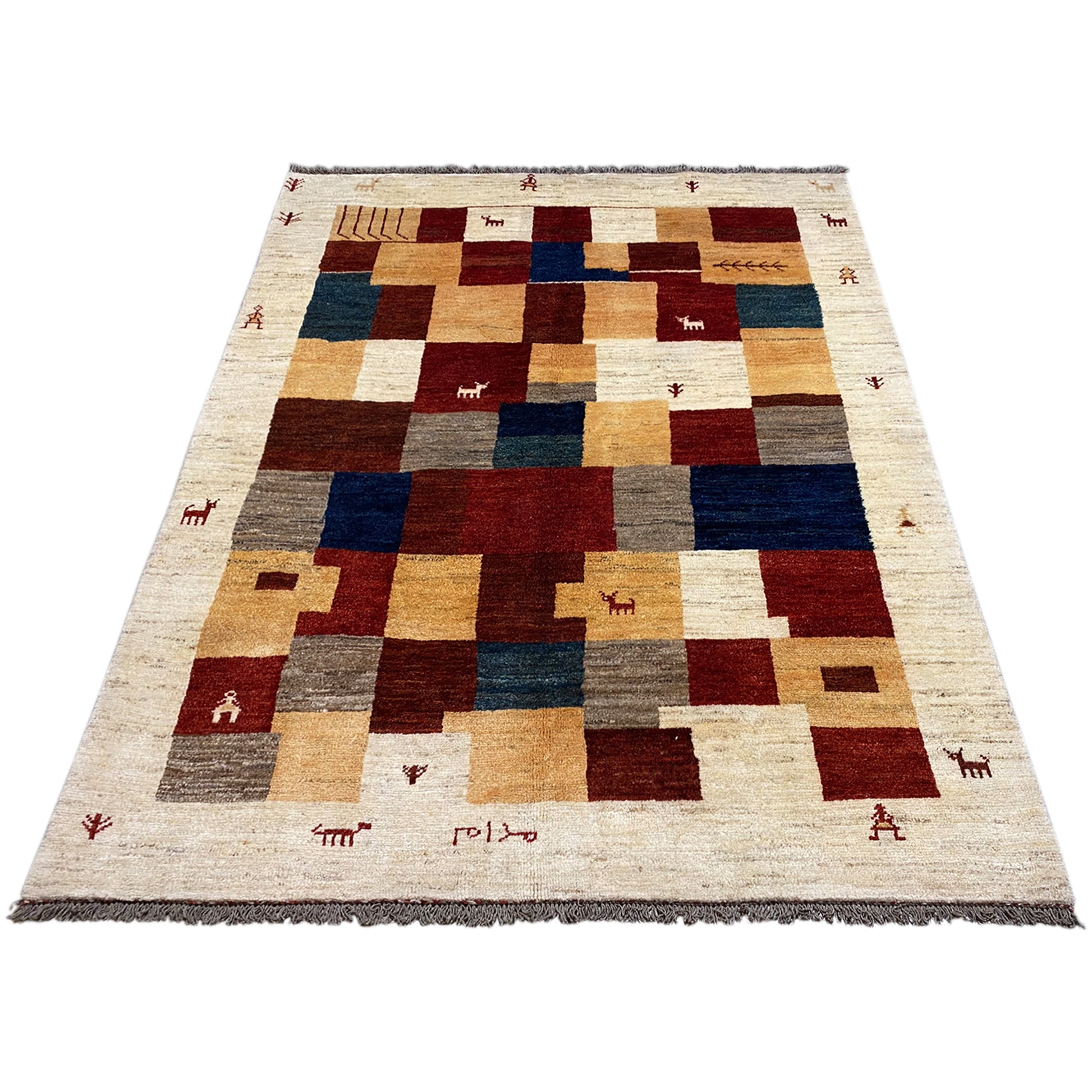 Ce tapis Gabbeh unique, noué à la main à partir de laine filée à la main et teinte aux plantes, fascine par un motif patchwork dynamique aux tons chauds de terre et de bleu vif, encadré d'une bordure claire ornée de charmants motifs stylisés d'animaux et d'humains. Avec ses dimensions généreuses de 229x163 cm, il constitue une pièce maîtresse idéale qui confère à toute pièce, du style traditionnel à l'éclectique, une atmosphère artistique et à la fois ancrée dans la nature. La combinaison de l'artisanat traditionnel et du design ludique fait de ce tapis un élément remarquable qui suscite à la fois un intérêt visuel et procure une sensation de confort.