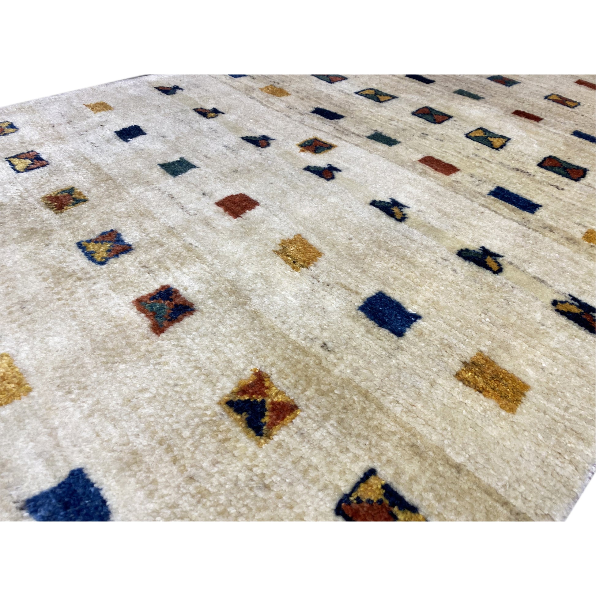 Ce tapis Gabbeh unique, noué à la main, de taille 152x89cm est fabriqué en laine filée à la main et teinte avec des plantes. Son design moderne se caractérise par un motif ludique de rectangles et carrés colorés sur un fond clair beige. Il apporte une touche vivante à chaque pièce, qu'elle soit de style moderne, contemporain ou éclectique, tout en offrant la chaleur naturelle et la texture d'un tapis Gabbeh authentique.