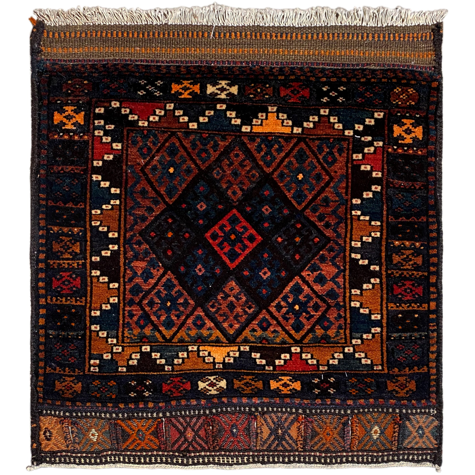 Ce tapis Poshti Hamedan noué à la main en laine et coton fascine par son motif géométrique détaillé en bleu marine profond et accents chaleureux. Avec ses dimensions de 82x72 cm, ce tapis est un complément idéal qui apporte à votre maison un style rustique ou traditionnel, créant une atmosphère authentique et chaleureuse.