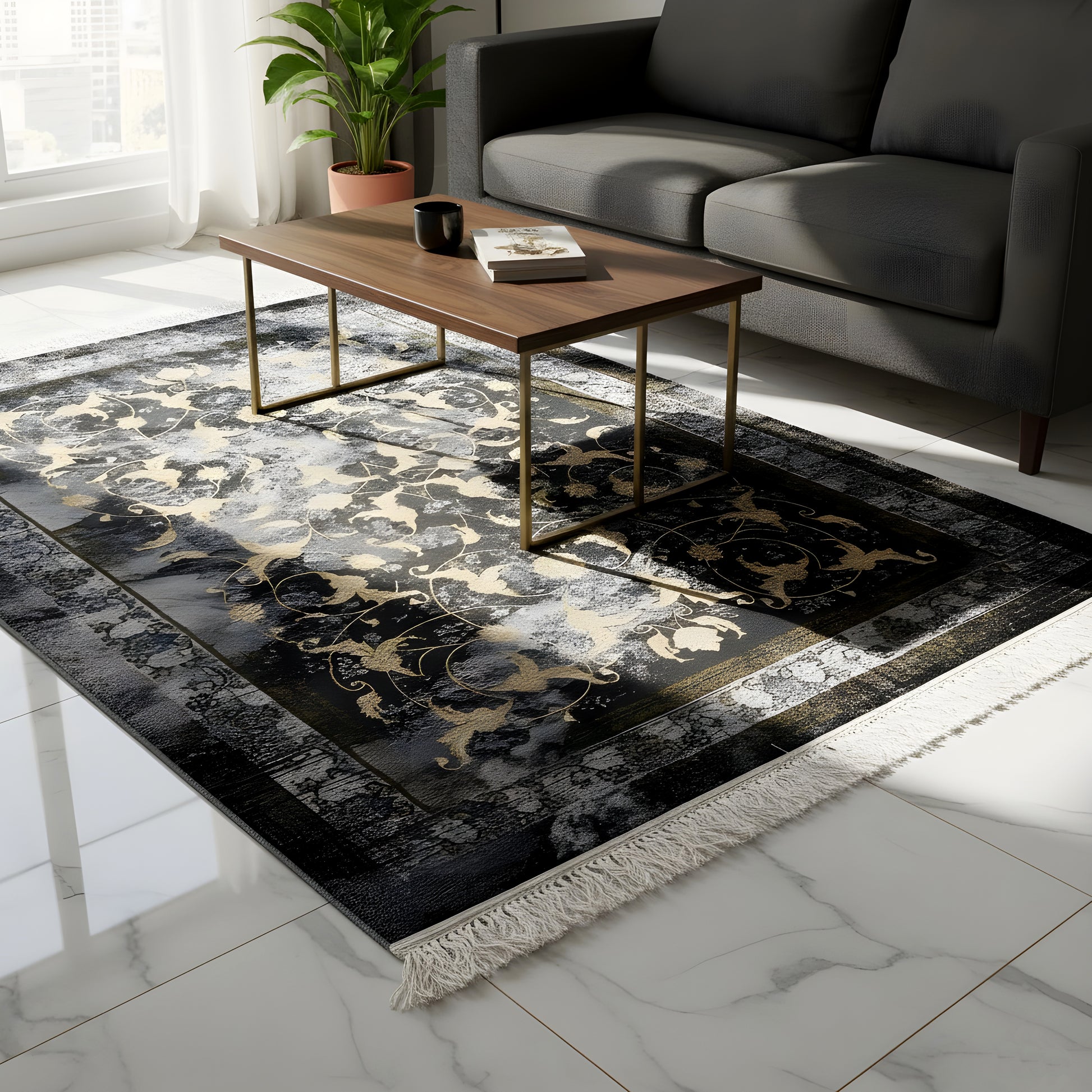 Apportez une touche d'élégance à votre intérieur avec notre tapis tissé "Kenza". Avec son design vintage élégant et ses accents modernes en or et noir, ce tapis s'intègre harmonieusement à tout décor. Fabriqué à 100 % en polypropylène, il est non seulement facile d'entretien et durable, mais aussi idéal pour les zones à fort passage. Le motif floral aux tons dorés nobles sur un fond sombre confère au tapis de 160x230 cm une allure luxueuse. Découvrez confort et style, parfaitement adaptés à votre salon ou chambre.