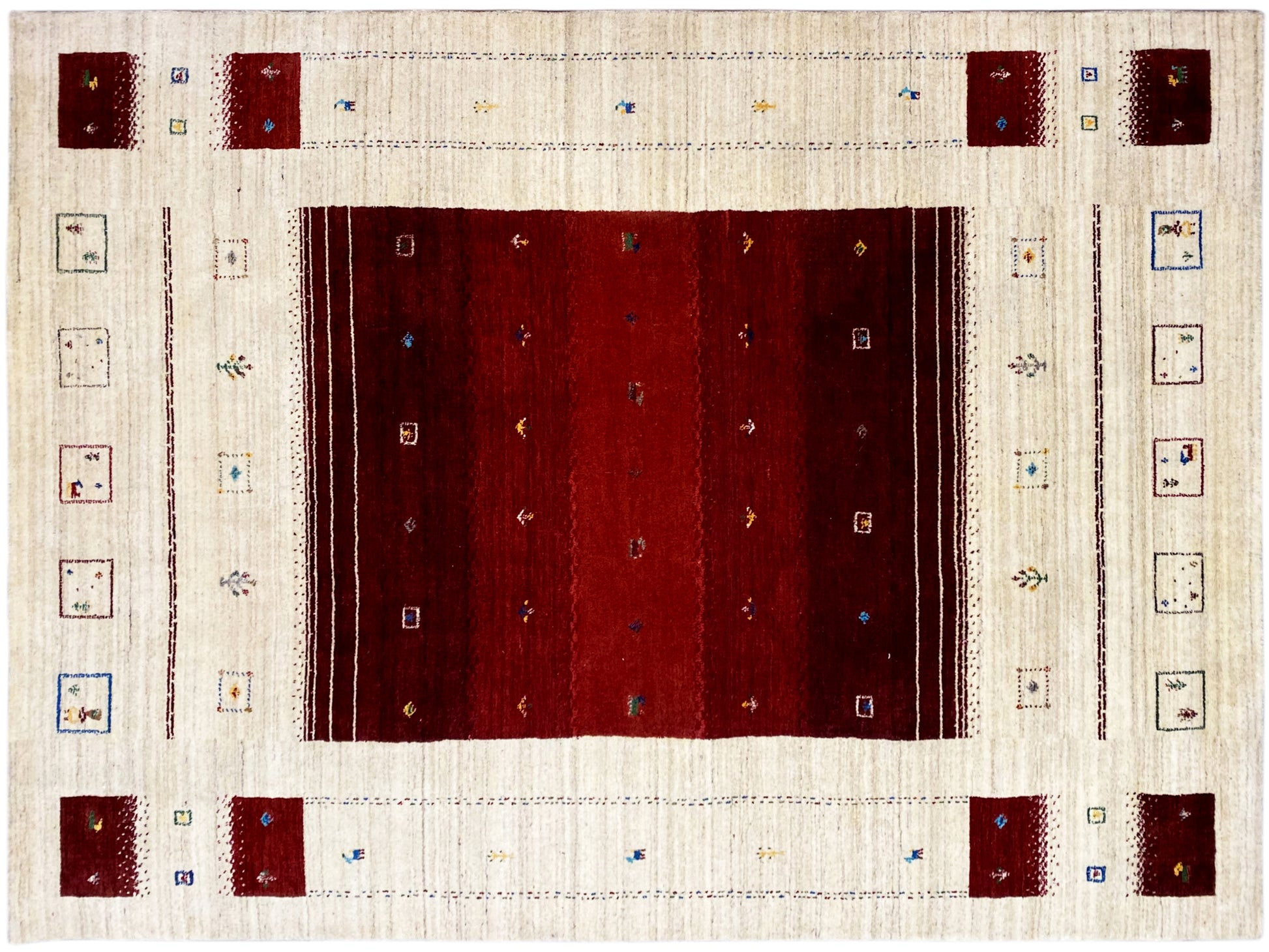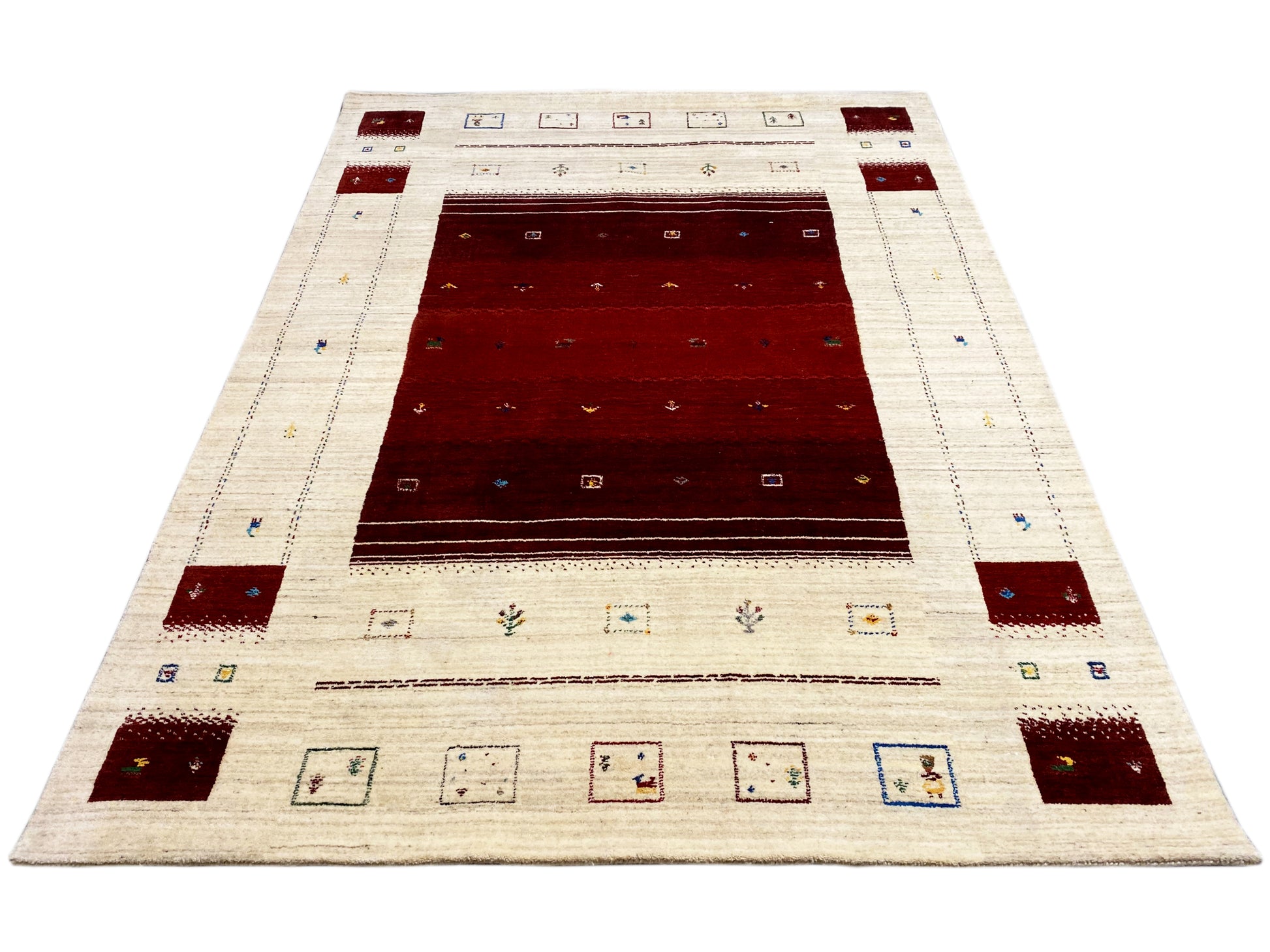 Dieser handgewebte Loom Luri Teppich in 174x240 cm besticht durch sein elegantes Design mit einem zentralen roten Feld und feinen, traditionellen Motiven auf hellem Hintergrund und passt perfekt zu modernen sowie klassischen Wohnstilen. Gefertigt aus hochwertiger Wolle bietet er eine angenehme Haptik, hohe Strapazierfähigkeit und langlebige Farbbrillanz. Das dezente, geometrisch inspirierte Muster sorgt für eine stilvolle Atmosphäre und setzt einen warmen Akzent in Wohn- oder Schlafräumen.