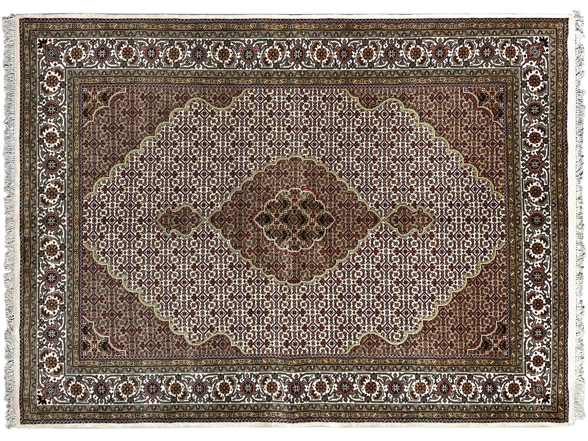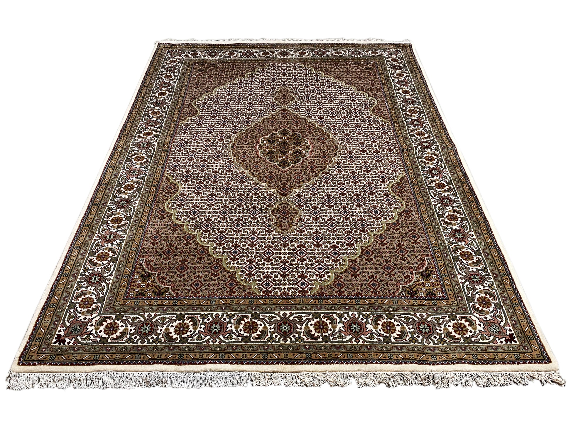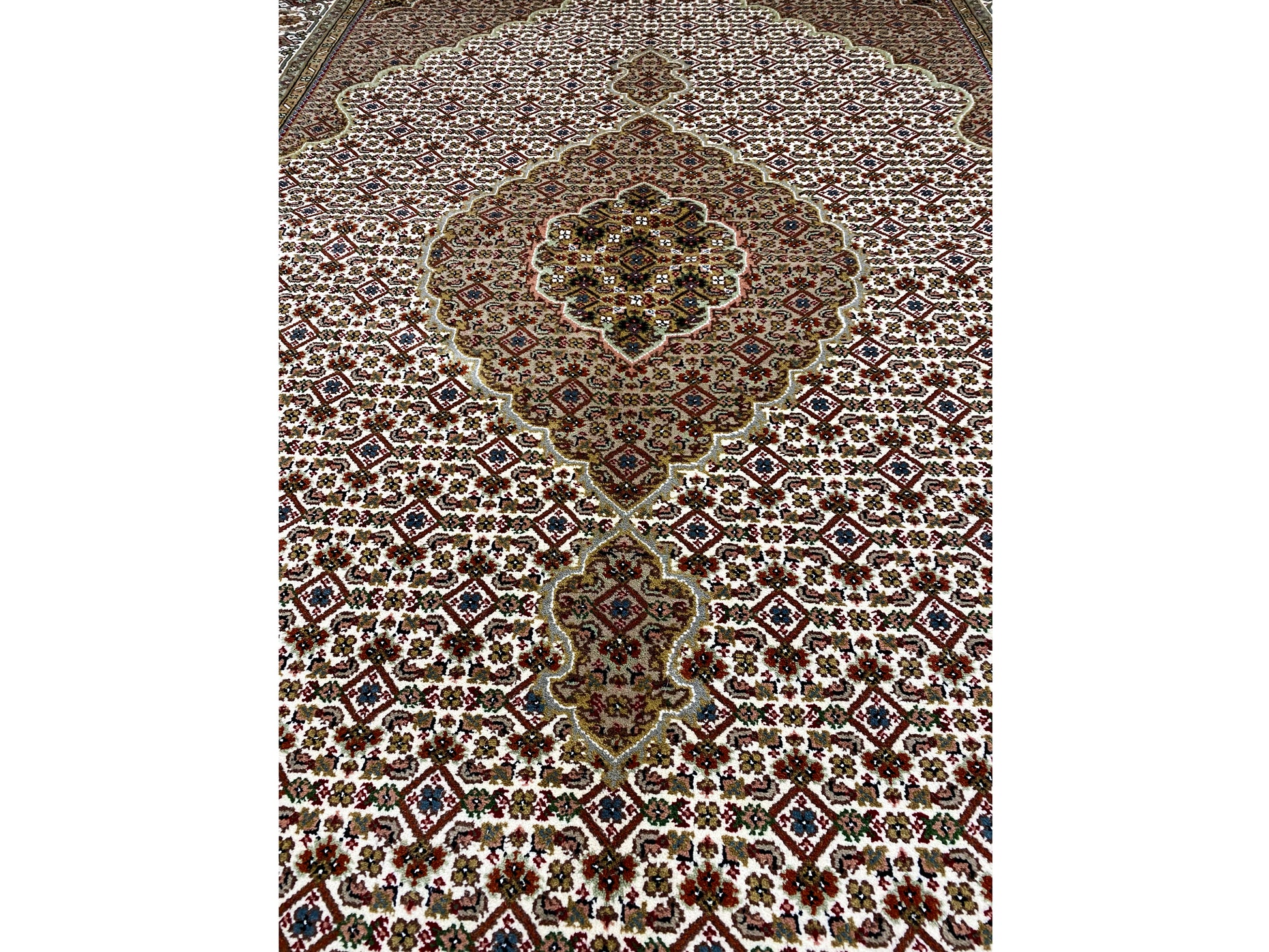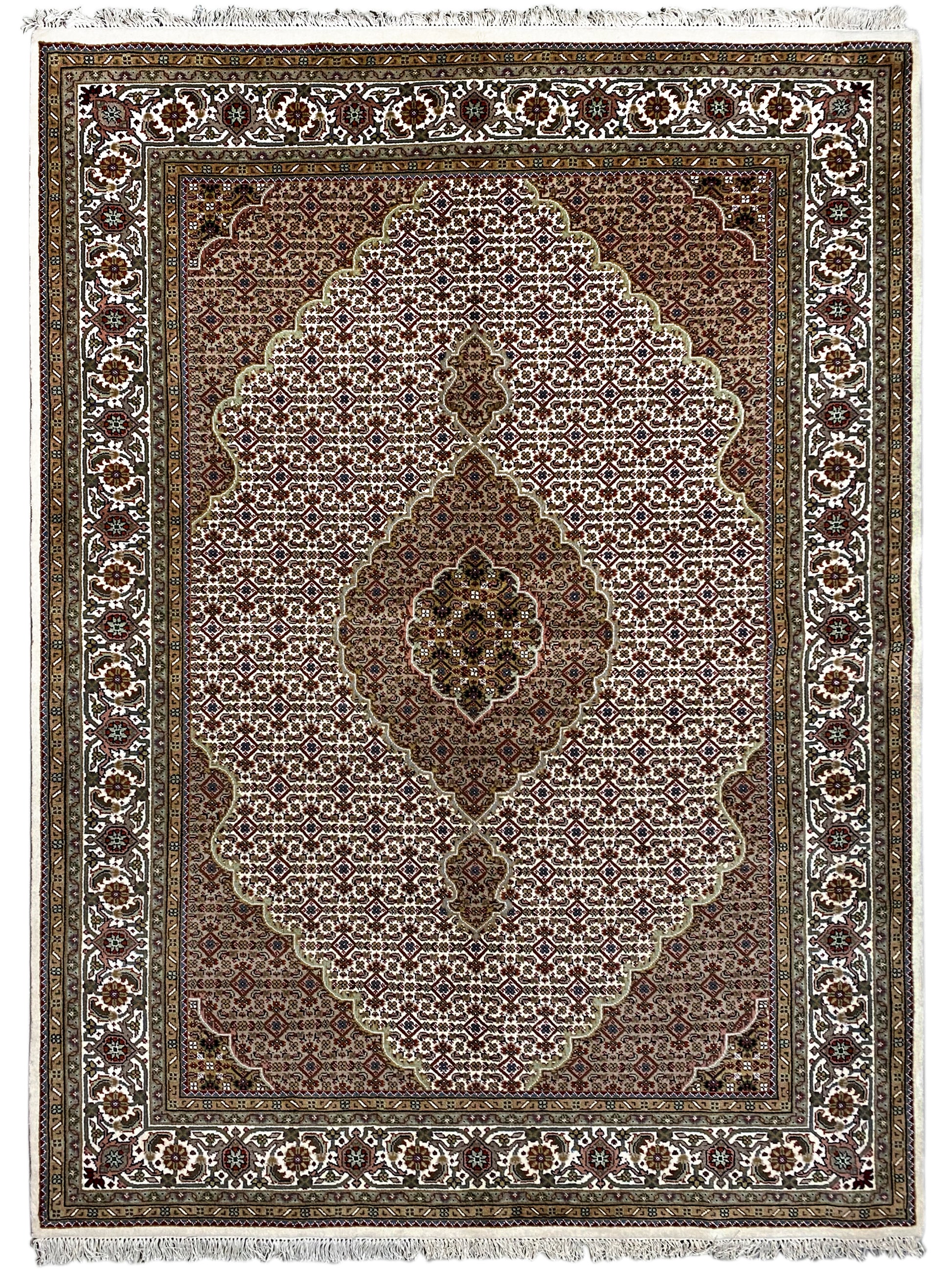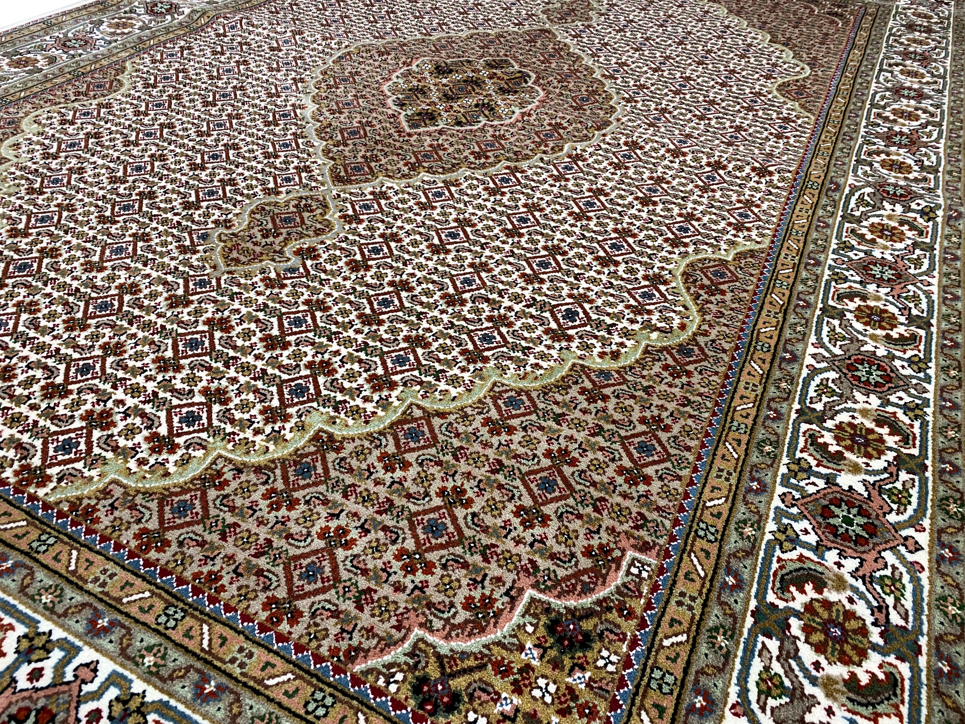 À l'origine, le Tabriz Mahi vient de Perse. Cependant, ces tapis sont désormais également noués à la main en Inde selon les mêmes standards de qualité. Nos Mahi sont des tapis haut de gamme et élégants, noués avec de la laine fine. Les tapis ont des couleurs vives, claires et profondes et sont très résistants grâce à leur bonne fabrication.
