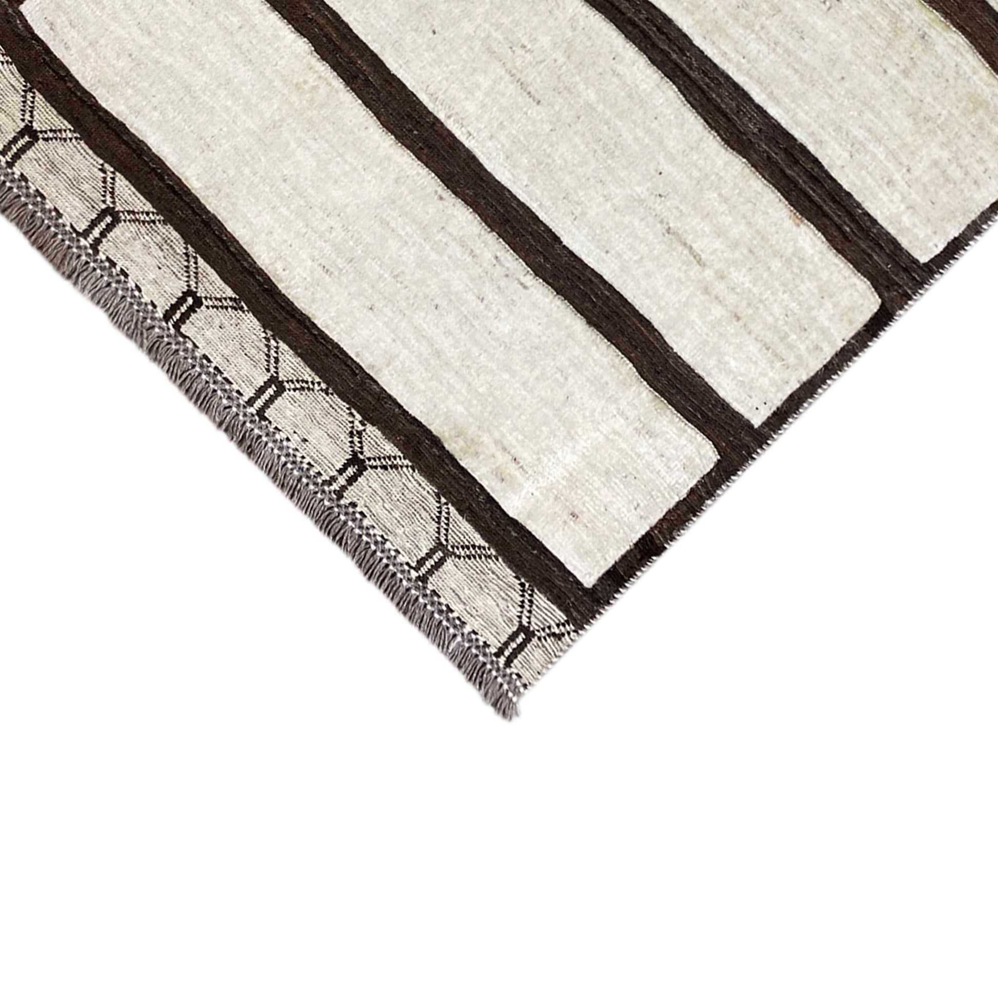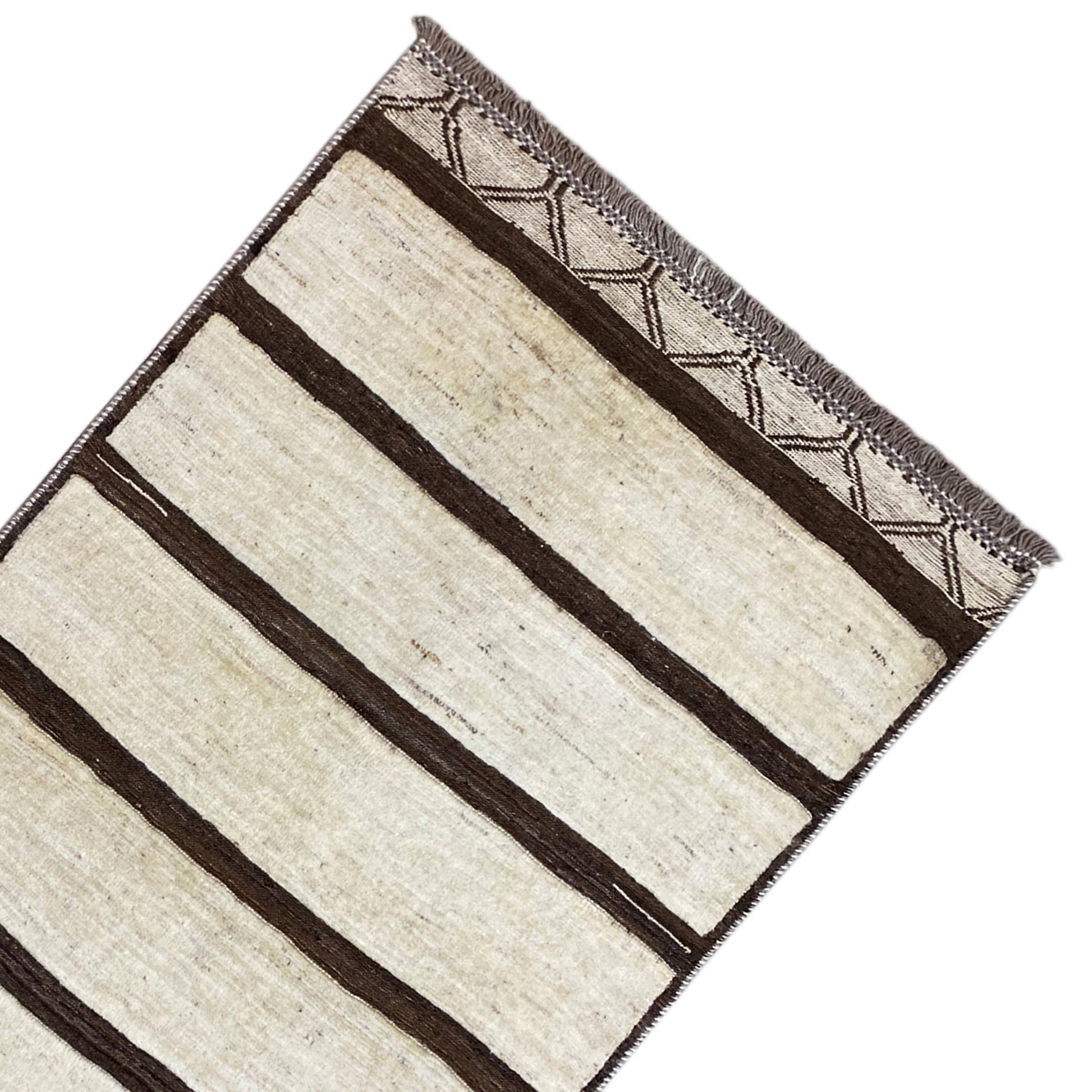 Fabriqué en laine filée à la main et teinte avec des plantes, le tapis présente un motif à rayures blocs calme dans des tons naturels beige et brun, accentué par de fins détails géométriques sur les bords. Avec ses dimensions compactes de 161x92 cm, il est idéal pour les petits espaces, les couloirs ou comme accent de design discret.