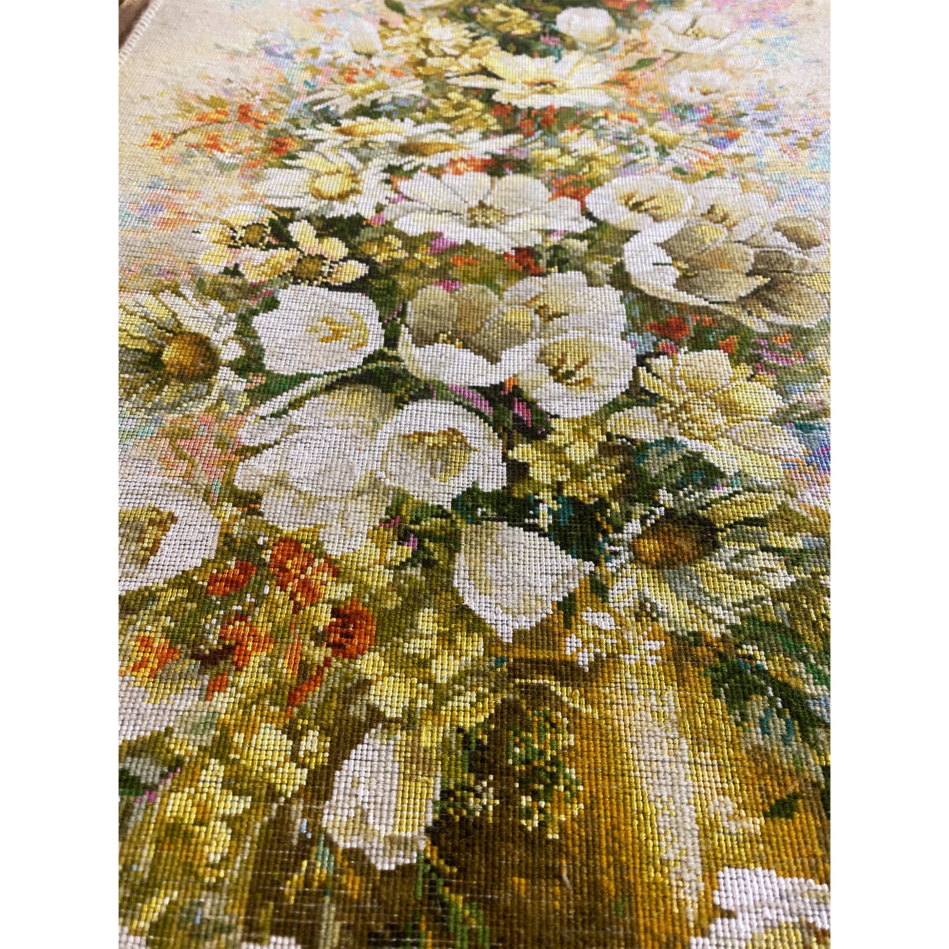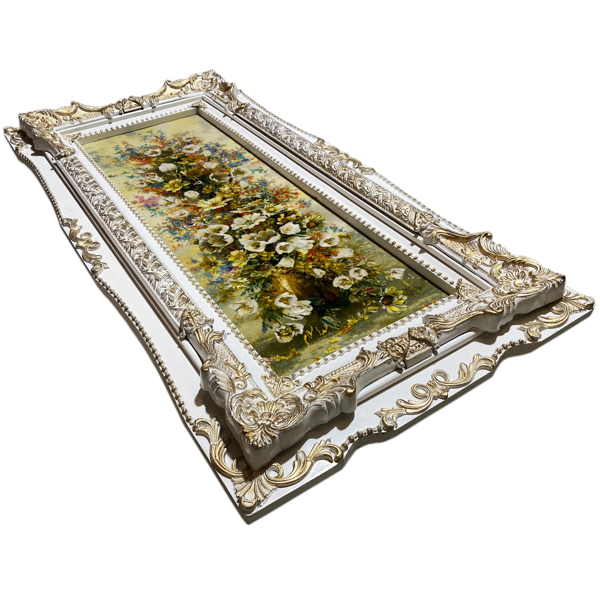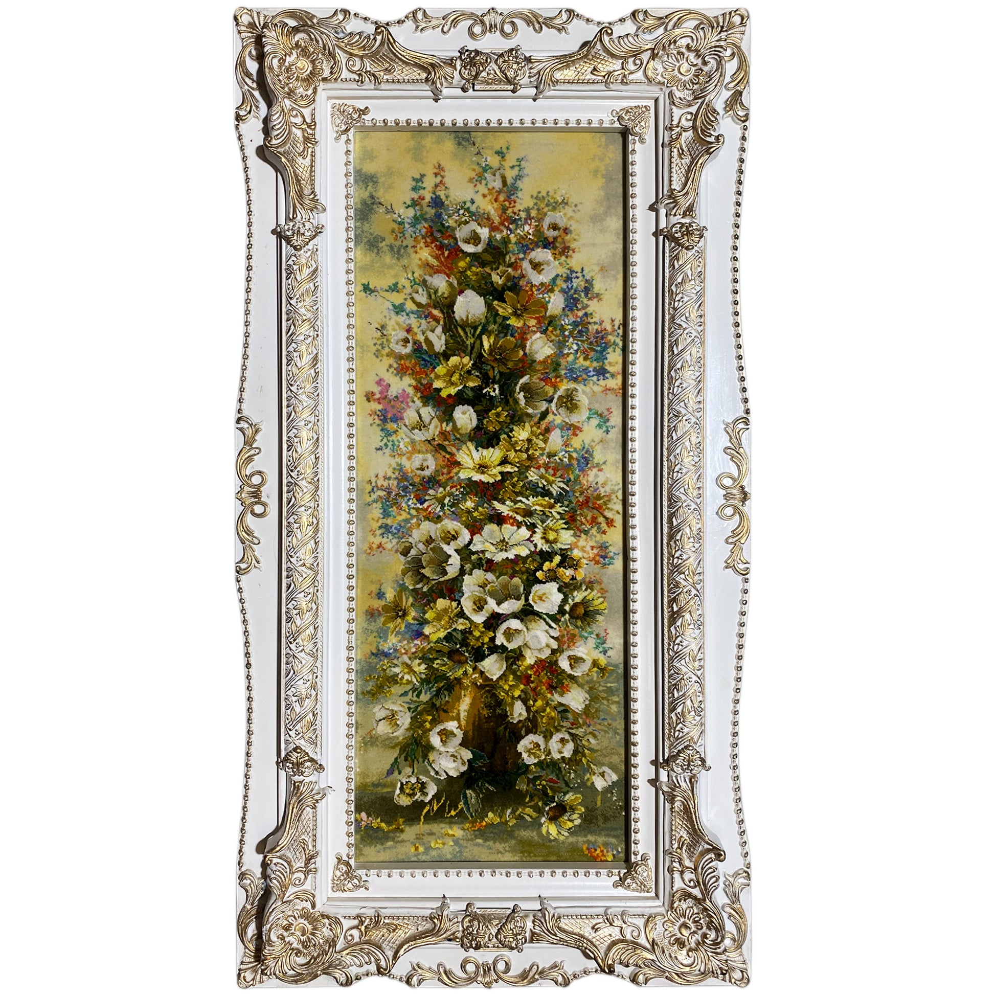 Ce tapis mural unique, noué à la main, de taille 98x37cm est fabriqué à partir d'un mélange noble de laine et de soie. Il présente un motif floral figuratif détaillé aux couleurs vives, arrangé dans une nature morte élégante. Encadré dans un style classique orné, ce tapis mural sert d'œuvre murale impressionnante, apportant une touche artistique et fraîche à tout intérieur.