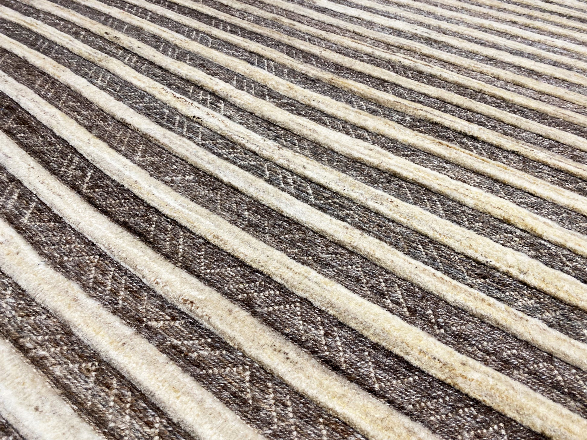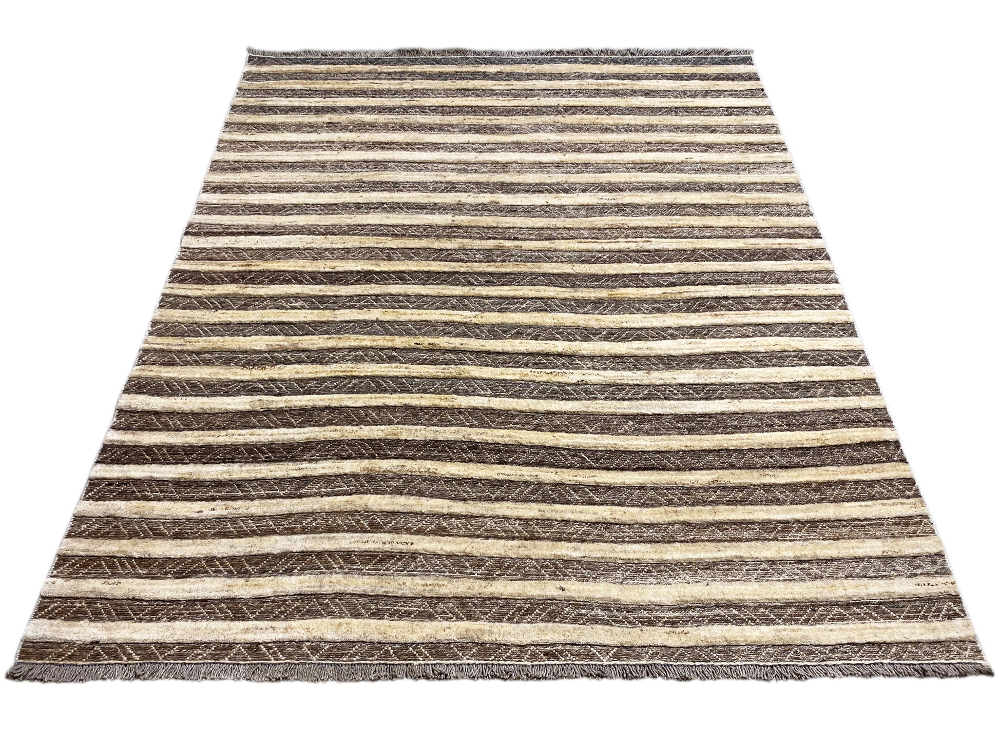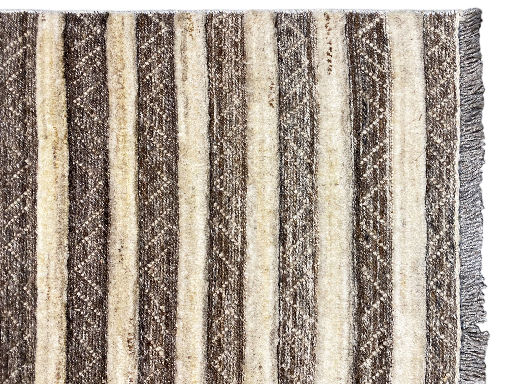 Ce tapis Kelim Gabbeh tissé à la main, aux dimensions de 186x157 cm, séduit par son élégance naturelle et sa fabrication de haute qualité en laine 100 % filée à la main. Le motif fin à rayures horizontales dans des tons harmonieux de gris et beige est complété par des détails géométriques discrets, qui confèrent au tapis une profondeur moderne. Grâce à son style décor intemporel, cette pièce unique et résistante s’intègre parfaitement dans des intérieurs scandinaves ou minimalistes, créant une atmosphère chaleureuse et accueillante. La structure dense de la laine naturelle garantit non seulement une longue durée de vie, mais aussi une sensation de confort exceptionnelle sous les pieds, faisant de ce tapis un élément fonctionnel remarquable dans tout salon ou salle à manger.