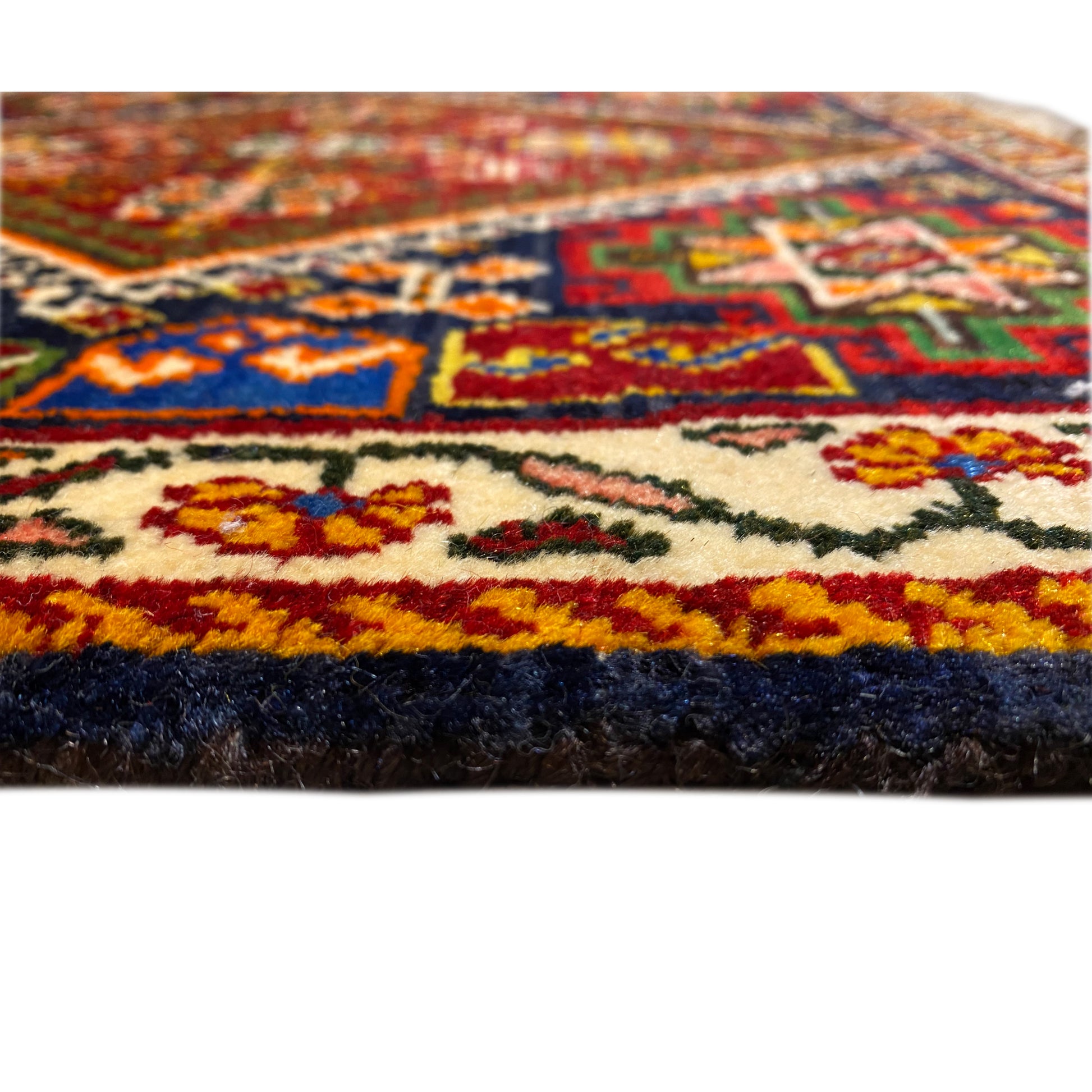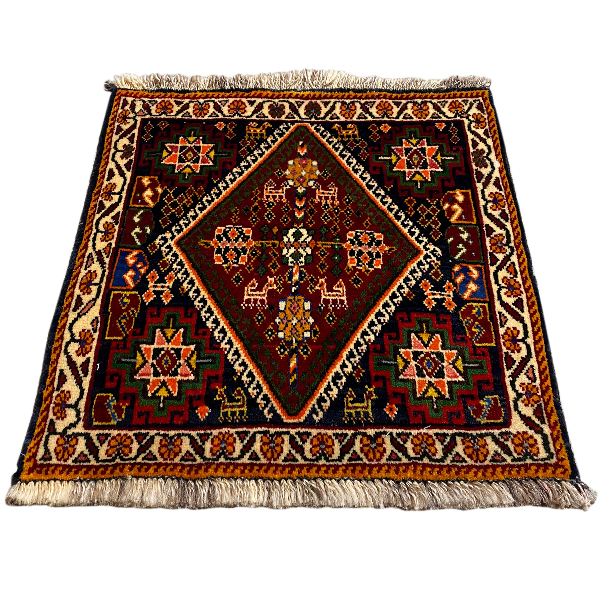 Ce tapis Poshti exquis, noué à la main, est un véritable joyau du sud de l'Iran, habilement fabriqué par le groupe tribal nomade "Tork", connu pour ses tapis "Torkey". Avec des dimensions de 57x56 cm, cette pièce présente une fascinante combinaison d'un bleu foncé profond en arrière-plan et d'un motif losange rougeâtre marqué au centre. Le médaillon central est rempli de motifs géométriques complexes et de style tribal, que l'on retrouve également dans les champs environnants et la bordure. Fabriqué en laine fine avec une chaîne en coton, ce tapis apporte à chaque pièce une touche d'authenticité traditionnelle et d'expression artistique.