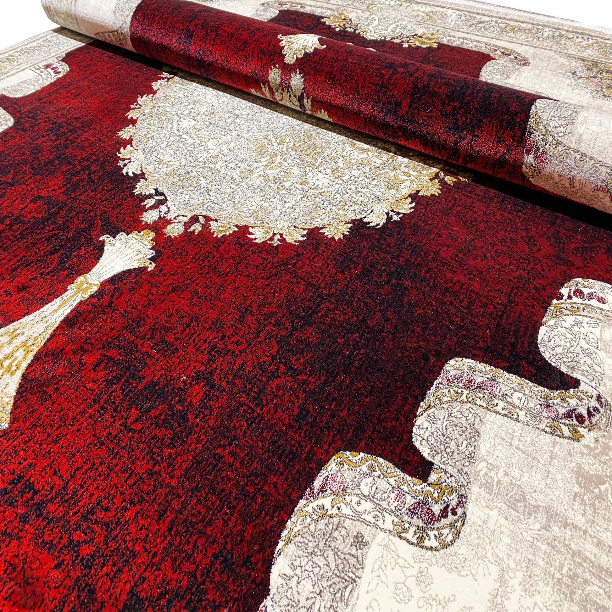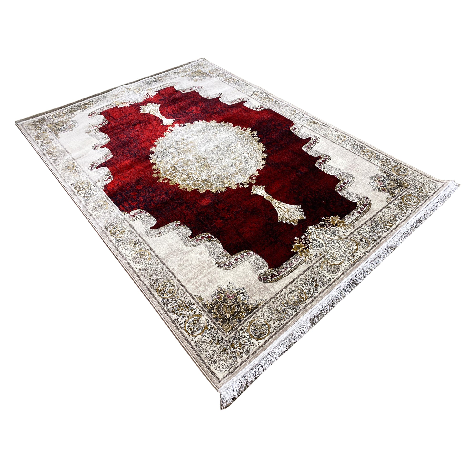 Transformez votre espace avec ce tapis classique saisissant et magnifique. Le champ intérieur rouge vif et le médaillon crème artistique créent un point focal luxueux, entouré d'une bordure finement conçue avec une forme unique. Fabriqué à 100 % en acrylique traité thermiquement, ce tapis doux et durable est parfait pour apporter chaleur et élégance à votre salon ou salle à manger. La taille généreuse de 170x240 cm est idéale pour définir une pièce et faire une déclaration.